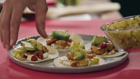 Inspirés par le Mexique, Bob et Véro préparent des tacos français au bœuf et des tacos rafraichissants aux crevettes. Pour le défi à l’aveugle, Bob doit assembler, plier et cuire un tacos. L’astuce du jour explique comment réaliser son hummus maison.